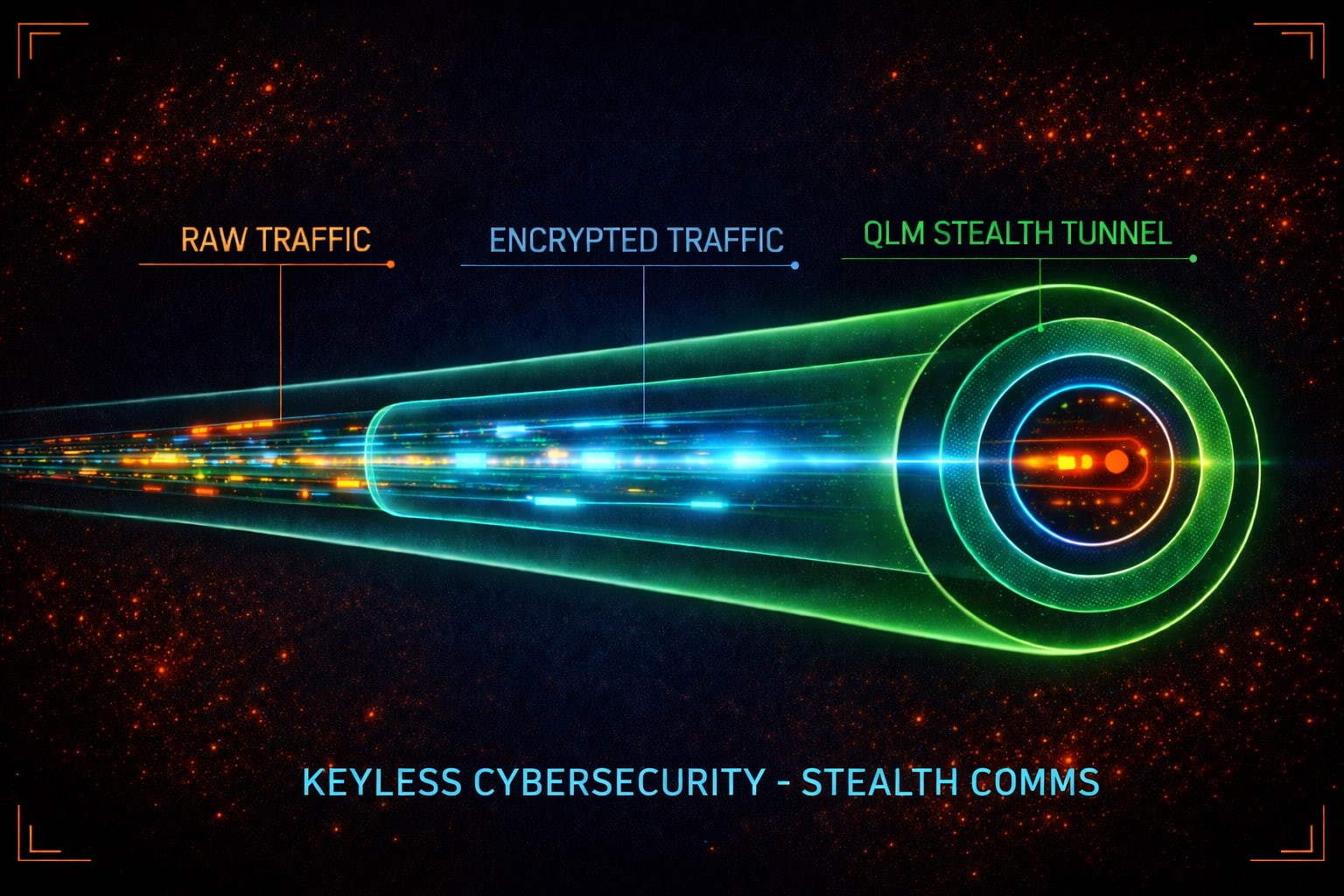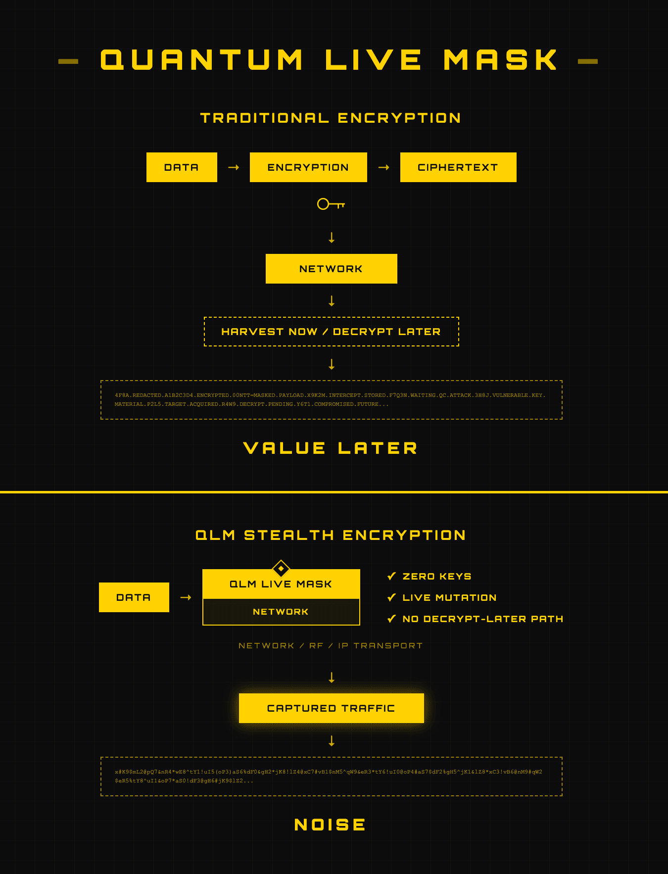 / DEFINITION TACTICAL COMMS—MADE STEALTH. KEYLESS QUANTUM-RESILIENT STEALTH TUNNEL A NEW CATEGORY. NOT A NEW CIPHER. NOT A NEW KEY LIFECYCLE. A MASKING LAYER THAT MAKES ENCRYPTED COMMS UNTOUCHABLE—WITHOUT GENERATING, EXCHANGING, STORING, OR MANAGING CRYPTOGRAPHIC KEYS. QLM® DOESN’T REPLACE ENCRYPTION. IT MAKES IT INVISIBLE. UNTOUCHABLE. TURN INTERCEPTION FROM FUTURE BREACH INTO DEAD CAPTURE. / ARCHITECTURE SOFTWARE-ONLY. NEAR-ZERO LATENCY. OS-AGNOSTIC. TARGET-COMPILED. KEYS ARE THE FAILURE MODE. QLM® INTRODUCES NONE. NO GENERATION. NO EXCHANGE. NO STORAGE. NO ESCROW. NOTHING TO STEAL. NOTHING TO HACK. / OPERATIONAL IMPACT NO NEW VENDORS. NO INFRASTRUCTURE SWAP. NO NEW INTERFACES. NO WORKFLOW CHANGES. NO NEW RUNBOOKS. NO TEAMS TO RETRAIN. NO BUDGET SURPRISES. YOUR TEAMS OPERATE EXACTLY AS BEFORE. DAY ONE LOOKS LIKE DAY ZERO. PROTECTION UPGRADES. OPERATIONS DON’T. QUANTUM PROTECTION AS AN OPERATIONAL NON-EVENT. / DEPLOYABLE IN WEEKS, NOT YEARS NOT THEORETICAL. NOT A ROADMAP PROMISE. PRODUCTION-READY. IT DOESN’T ADD COMPLEXITY. IT ADDS STEALTH. / THE RESULT WE REMOVED THE KEY. THE LOCK. AND THE DOOR. THE INDUSTRY IS RACING AGAINST QUANTUM COMPUTE. ALGORITHMS SUNSET. SECURITY WINDOWS SHRINK. ROI SHRINKS WITH THEM. THAT RACE HAS AN EXPIRY DATE. QLM® DOESN’T RACE. IT EXITS THE RACE ENTIRELY. THE FAILURE MODE WAS THE KEY. NO KEY GENERATION. NO EXCHANGE. NO STORAGE. NO ATTACK SURFACE THAT SCALES WITH COMPUTE. RESISTANT BUYS TIME. RESILIENT MAKES ADVERSARY COMPUTE ADVANTAGE IRRELEVANT. QLM® IS QUANTUM-RESILIENT — NOT QUANTUM-RESISTANT. EVERY STORED PACKET STAYS WORTHLESS. TODAY. TOMORROW. POST-QUANTUM. CAPTURE EVERYTHING. DECRYPT NOTHING. REMOVE THE EXPIRY DATE FROM YOUR STACK.