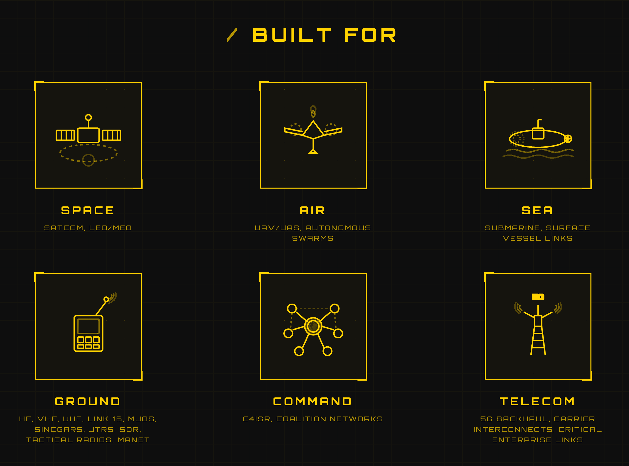 / NO RE-CERTIFICATION Your certified encryption stays certified. Your certified hardware stays certified. Your operators stay qualified. QLM® overlays your communications nervous system: multi-vendor, multi-domain, legacy to new. C2/C4ISR. Coalition networks. Tactical edge. No algorithm swap. No key-management replacement. Protocol-agnostic. Infrastructure intact. Transparent to operators. Stealth to adversaries. From near-obsolete to mission-ready. / STEALTH FOR C2 STEALTH THE BRAIN. STEALTH THE NERVOUS SYSTEM. C2 is the brain. Comms are the nervous system. Protect the nervous system — protect the decision. One deployable layer across every domain — legacy to modern, vendor to vendor. C2 vendors build the brain. QLM® removes the leverage. No keys. No retrospective compromise. / BUILT FOR Command: C2/C4ISR, coalition networks, joint operations. Ground: HF/VHF/UHF, Link 16, MUOS, SINCGARS, JTRS, SDR, MANET. Air: UAV/UAS, autonomous swarms. Sea: submarine and surface-vessel links. Space: SATCOM, LEO/MEO links. Telecom: 5G backhaul, carrier interconnects, critical enterprise links.
