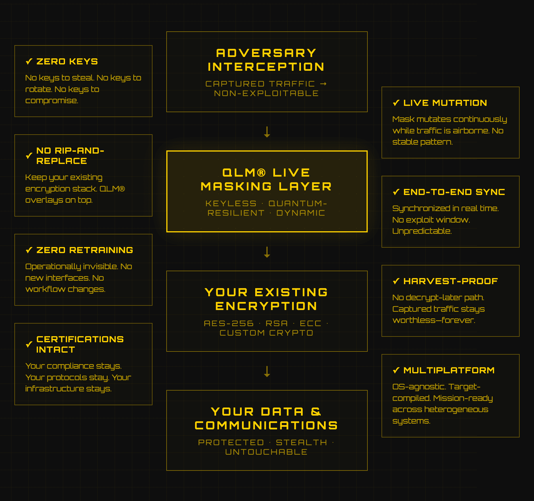 Three words. One disruptive model. MILITARY-GRADE. POST-QUANTUM CYBERDEFENSE. QLM® (Quantum Live Mask) is a keyless, quantum-resilient live-masking layer that wraps your existing encrypted traffic inside a stealth tunnel — with no keys on the wire and no changes to your certified stack. Capture it. No recoverable plaintext. Harvest Now, Decrypt Later. Solved. / QUANTUM Quantum Computers threaten security by targeting key material. We removed the key domain entirely. No keys to steal. No keys to recover. No keys to break. Nothing to hack. / LIVE The mask mutates continuously while traffic is in the air. Synchronized end-to-end, in real time. No stable pattern. No exploit window. Unpredictable. alive. / MASK A keyless channel-level overlay that creates a stealth tunnel around your existing encrypted traffic. No keys on the wire. No rip-and-replace. AES-256. RSA. ECC. Custom crypto. If it's key-based, QLM® wraps it. No session keys in transit. No harvest-now, decrypt-later path. Captured traffic stays worthless.